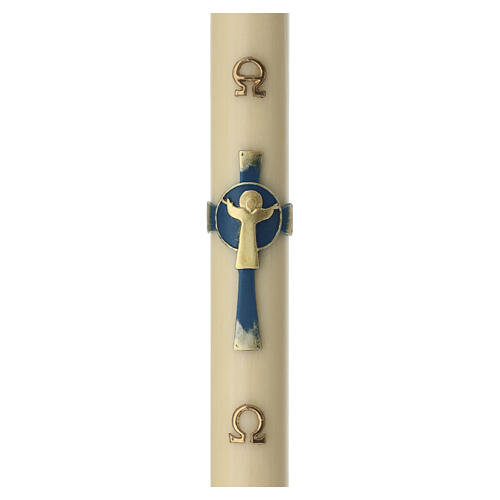 Ivory Paschal candle in beeswax with blue cross and Risen Jesus, 47x3 in.