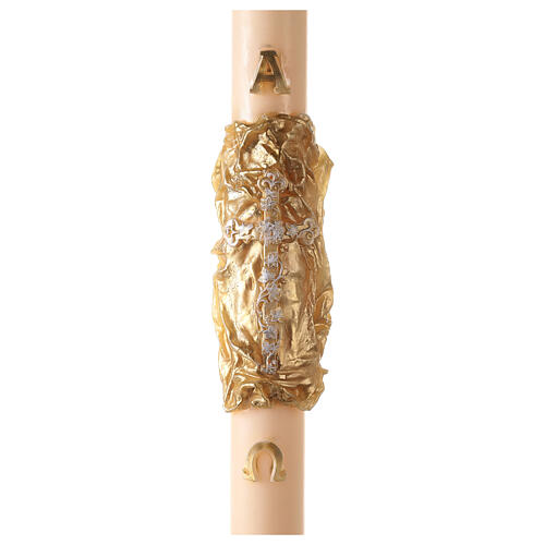 Ivory Paschal candle with Alpha, Omega and cross on an embossed golden cloak 120x8 cm