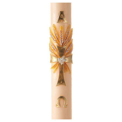Ivory Paschal candle with cross and ears of wheat 120x8 cm. Large Paschal candle handmade with high-quality paraffin wax and painted by specialised artists in Italy. Made with hig temperature-resistant materials, this candle is decorated with an embossed golden cross with a white dove in the centre and ears of wheat above it, completed by the letters Alpha and Omega.