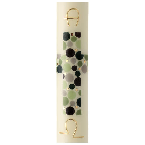 Ivory Paschal candle with green modern cross and golden Alpha and Omega, 16x3 in. Ivory-coloured Paschal candle with modern cross made of green dots and golden inscription of Greek letters, Alpha and Omega.