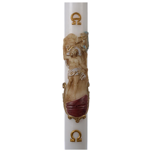 Paschal candle in white wax with support and painted Resurrected Christ 8x120cm.