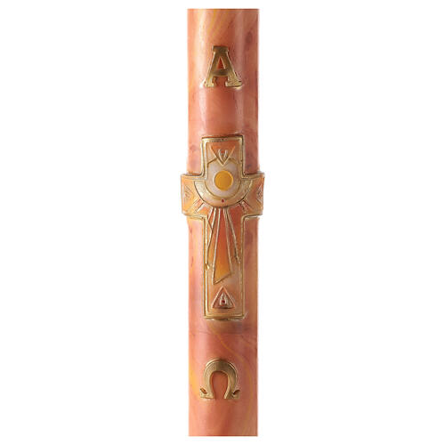 Paschal candle with Alpha, Omega and cross with sun on orange marble finish 120x8 cm