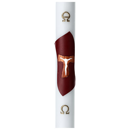 Paschal candle with Tau, white wax with inner reinforcement, 3.15x47.25 inches. Paschal candle made of white wax with inner metal reinforcement, decorated with a wooden Tau cross in the centre on purple background with golden symbols of Alpha and Omega.
