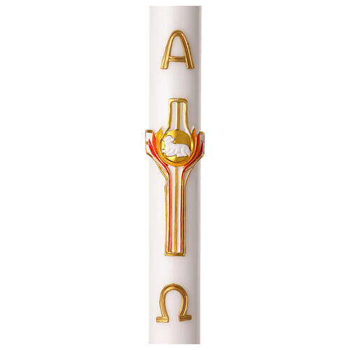The centre features a stylised cross embellished with golden and red details. Inside the cross, the image of the seated Paschal Lamb, symbolising the risen Christ, is depicted. Above and below, silver-coloured Alpha and Omega letters represent Christ's eternity and totality.