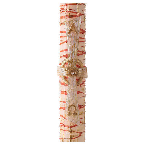 The candle is decorated with an horizontal pattern of red drops remembering blood and a white modern cross with wood finish, enriched by a central Easter Lamb and letters Alpha and Omega on the edges.