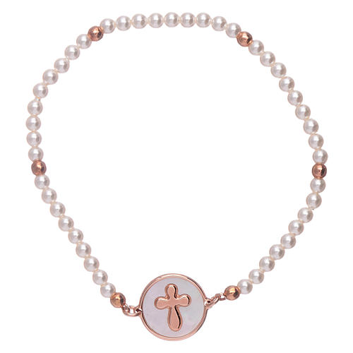 AMEN bracelet with crystal beads inserted on a transparent elastic and 925 sterling silver rosè medalet finished in mother of pearl. Bracelet for women with 2 mm beads alternated with rosè 925 silver sterling beads, and with a circumference of 19 cm. This jewel is entirely made in Italy according to high quality standards by a specialized company. Weight of the jewel: 3,10 grammes.