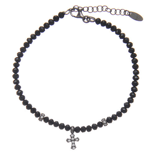Elegant bracelet in 925 sterling silver finished in rhodium, coloured in black with black crystal multifaceted grains sized 2 mm. The bracelet has a total circumference of 21 cm and is equipped with an adjustable snap hook closure. It is characterized by two small rings and a cross decorated with white zircons. The high quality of this jewel is guaranteed by the Italian production company. Jewel weight: 4,8 grammes.