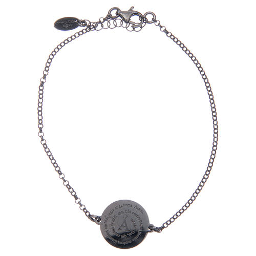 Amen bracelet in burnished 925 sterling silver with Angel of God prayer in Latin. At the centre of the bracelet there is a round plate with the incision of the prayer Angel of God in Latin. It has a snap hook closure and an adjustable chain up to 3 cm. Jewel weight: 2,2 grammes.