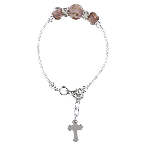 LUCY bracelet in lilac Murano glass with 0.04-inch round beads and a silver‑finish metal setting. The beads are mounted on a flexible, durable wire and embellished with a small silver cross. Adjustable length from 6.3 to 7.9 in with a silver‑tone lobster clasp and extension chain for a secure fit.
