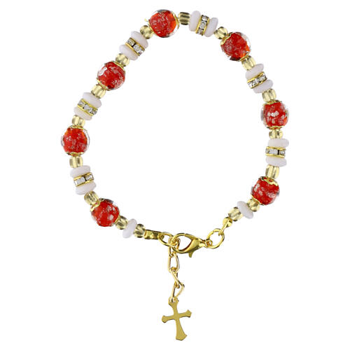 Murano glass bracelet with 0.31-inch red beads and semigloss white beads, gold accents