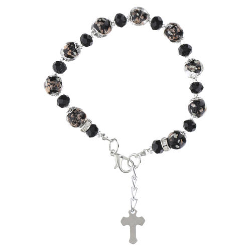 ROSE women's bracelet in Murano glass, featuring 0.4-inch black lampworked beads with gold details alternated with 0.2-inch faceted Bohemian crystals in a silver finish.