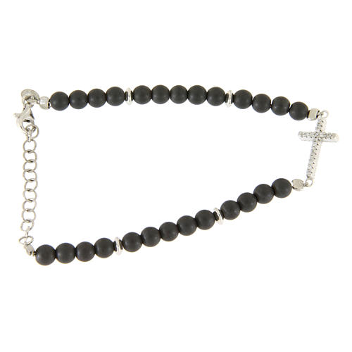 - Bracelet in 925 sterling silver, hematite opaque balls and white zirconate cross