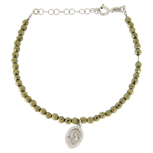Bracelet with hematite gold stones and religious medalet with white zircons. Elegant bracelet for women made in Italy by a company that produces silver jewels. Weight of the bracelet: 4,90 grammes.
