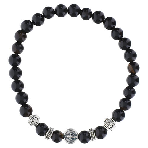 Elastic single-decade rosary bracelet with Miraculous Medal, 0.24-inch onyx beads.