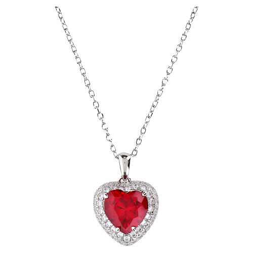 Rhodium-plated 925 silver necklace with a heart-shaped pendant featuring a 0.31-inch central cherry-red zircon set in a pavé of white zircons. The pendant has a symmetrical polished heart silhouette mounted on a rhodium-plated base and is suspended from a fine-link chain.