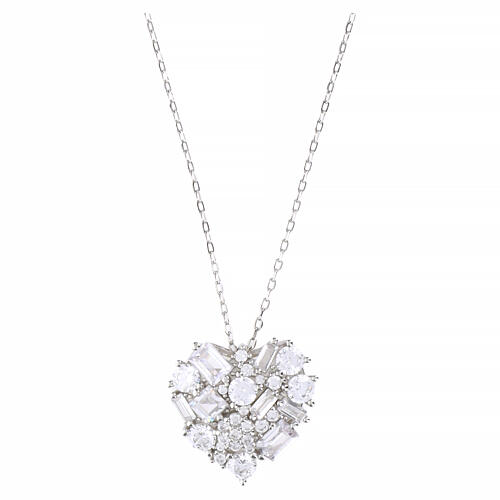 Necklace in rhodium-plated 925 silver with a heart-shaped pendant made from an assembly of white zirconia in multiple cuts and sizes.