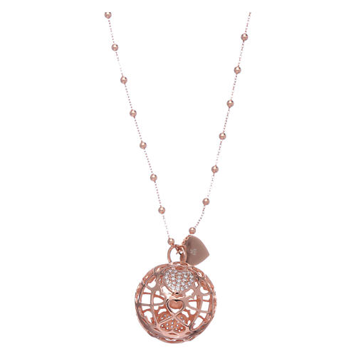 Amen necklace, angel caller with a 90 cm chain embellished by silver details and fine pearls in 925 sterling silver finished in rosè. The peculiarity of this necklace is a sphere pendant in opaque silver, sized 20 mm, with a small sphere inside which makes a delicate sound: the call to the angels to watch over the mother and the baby. The sphere pendant has a band with the Amen incision. It has an adjustable snap hook closure which permits to adjust the necklace up to 2 cm and a small angel charm. High quality jewel made by the Italian company Amen. Jewel weight: 14,50 grammes.
