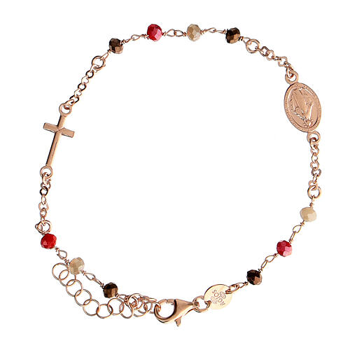 Agios bracelet with red and brown beads and Miraculous Medal, rosé 925 silver. Chain bracelet of rosé 925 silver with beads of faceted stone in different shades of red and brown, a cross and a Miraculous Medal inserted in the chain.