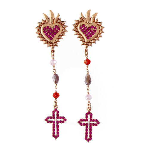Agios Sacred Heart drop earrings with red ruby rhinestones and stones. Drop earrings of rosé 925 silver, characterised by a Sacred Heart and a cut-out cross connected by a small chain with three stone beads and both enriched by red-ruby rhinestones. The beads on the small chain has three different colours and shapes.