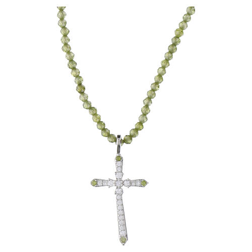 Necklace featuring olive‑green brilliant‑cut glass beads and a central pendant cross in rhodium‑plated 925 silver set with white and green rhinestones.