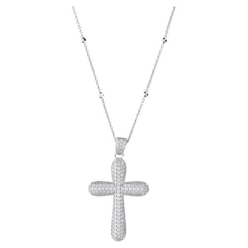 Rhodium-plated 925 silver necklace with domed cross, pavé of white rhinestones, Benedictus.