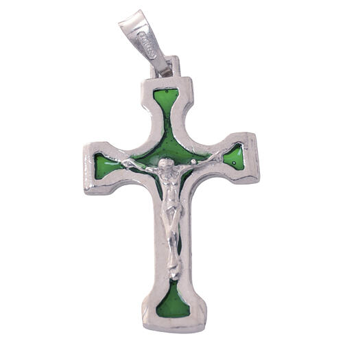 Pendant crucifix in silver and green enamel measuring 1,18 x 0,79 in. This pendant is 100% made in Italy and is made of 925 silver.