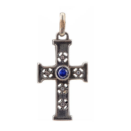 Pendant Romanesque cross in sterling silver with stone and silver finish. This jewel is entirely made of sterling silver with the process of lost-wax casting and then hand finished. This pendant weighs 0,09oz. The stones are hand set.