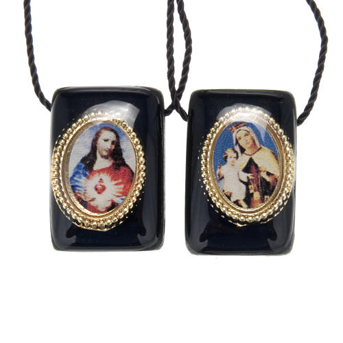 Catholic scapular made of black wood with medals. The medals depict Jesus and Our Lady with Baby Jesus. Attached by a black cord