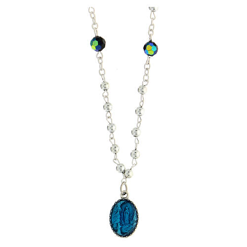 Necklace with crystals, Miraculous Medal and Our Lady of Lourdes 1.5 cm. Metal necklace of 57 cm of circumference made of five decades of silvery metal beads, 4 Pater beads of black crystal and an oval pendant with Our Lady of Lourdes on one side and the Miraculous Medal on the other, made of silvery metal and clear blue enamel.
