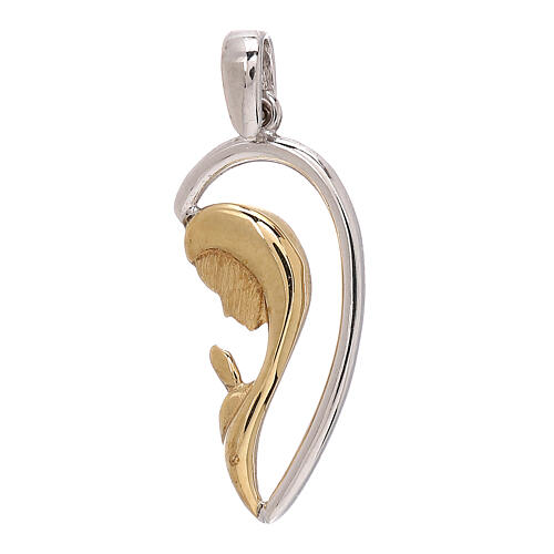 This 18-carat gold pendant features a rhodium-plated white gold exterior and a satin-finished yellow gold interior with the profile of the praying Madonna.