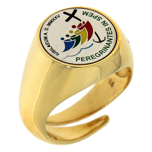 Signet ring of 24K gold-plated 925 silver, featuring a 0.5 in medal depicting the official logo of the Jubilee 2025. The ring has a diameter of 0.75 in.
