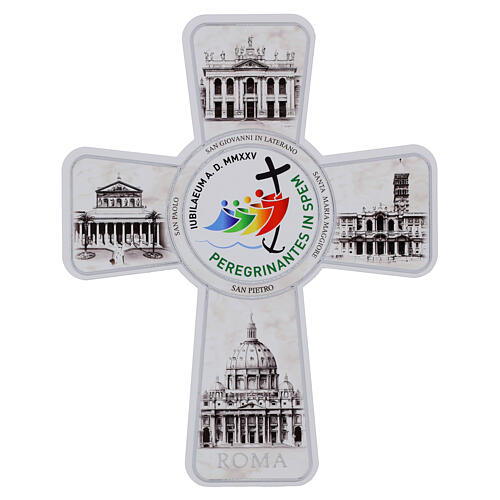 Each side and the bottom of the cross feature one of the four main basilicas of the Jubilee 2025, while the colourful and Latin official Jubilee logo stands out at the centre.