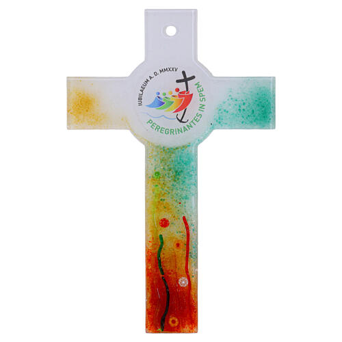 Decorated Murano glass cross of Jubilee 2025, 10x7 in. This wall cross features a Murano glass structure with central circle adorned with the logo and colours of the Jubilee 2025, measuring 9.8x6.5 in. Crafted with a refined design, the Murano glass structure includes a central circle and decorations inspired by the official colours of Jubilee 2025. The event's logo is intricately incorporated into the design, making the cross an exclusive symbol of the celebration. Made in Italy with precious m...
