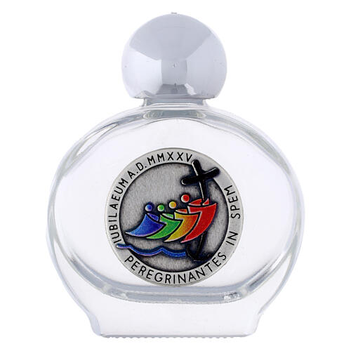 Holy water bottle made of glass, adorned with a silver medal featuring the official logo of Jubilee 2025 in colour.