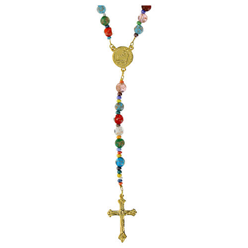Characterised by colourful beads of 0.3 in, this rosary is made with a steel cable of 1.5 in and enriched by a cross and a medal of gold plated metal.