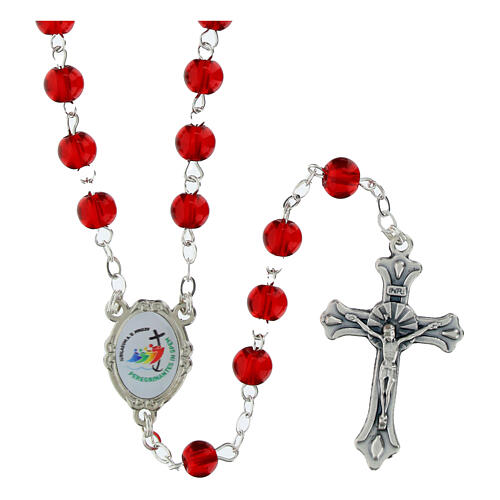 Red rosary of Jubilee 2025 Latin official logo with case, 0.2 in beads. Plastic case, decorated with the official logo of Jubilee 2025, containing a red rosary with a 0.8x0.6 in medal and a 1.5x0.9 in crucifix. The medal is enhanced by the official logo of Jubilee 2025.