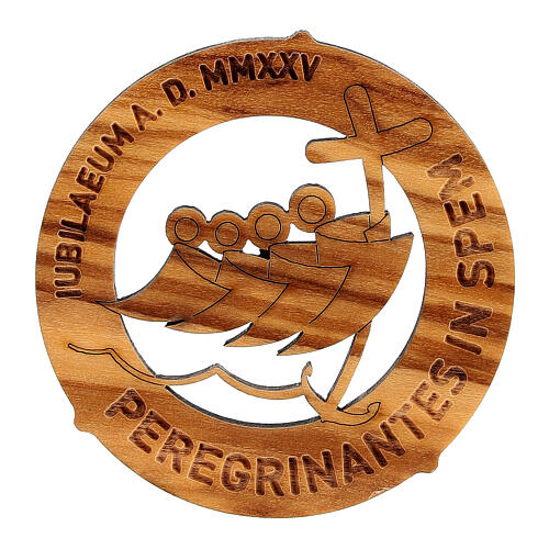 Round magnet with official 2025 Jubilee logo in Latin, olivewood, 2 in. This olivewood round magnet, made in Italy, features the official logo of Jubilee 2025 in Latin. The design includes the engraved motto and the image of pilgrims clinging to the anchor, symbolising hope and faith.