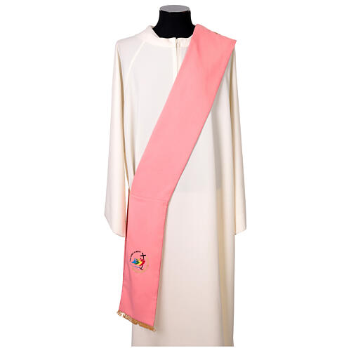 Diaconal stole crafted from pink polyester fabric and adorned with machine embroideries depicting the official symbols of Jubilee 2025.