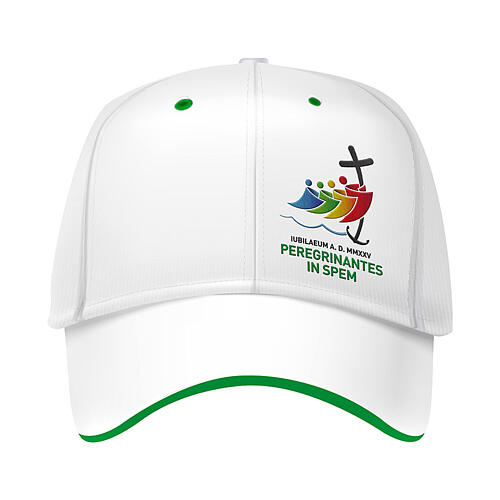 White baseball cap with embroidered patch of the 2025 Jubilee logo, pilgrim's kit. White baseball cap with the official logo of the 2025 Jubilee Pilgrims of Hope on an embroidered patch.