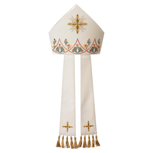 Made of precious ivory-coloured fabric, enriched with refined floral embroideries in orange and green tones, featuring a geometric pattern reminiscent of traditional ecclesiastical decorations. The front part is embellished with a golden embroidery depicting a radiant cross, symbol of light and spirituality. The long and linear lappets are adorned with embroidered golden crosses and finished with gold tassels, adding solemnity an...