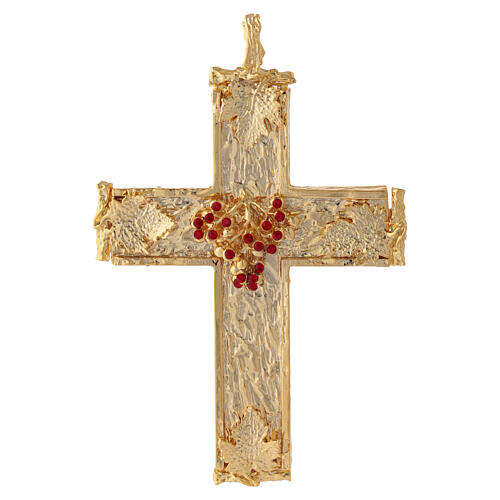 Pectoral cross with grape cluster, 5x3 in, 18K gold-plated brass with red crystals Pical Arte Creazioni.
