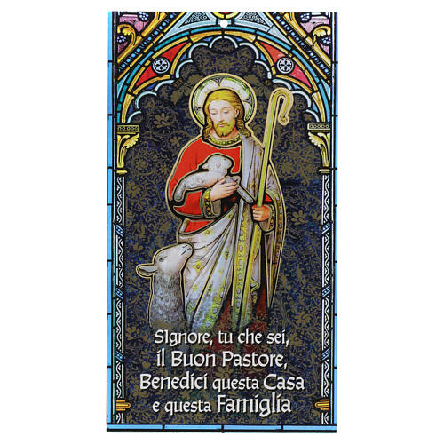Cardboard depicting Jesus the Good Shepherd with a lamb in His arms, holding a staff in His left hand.
