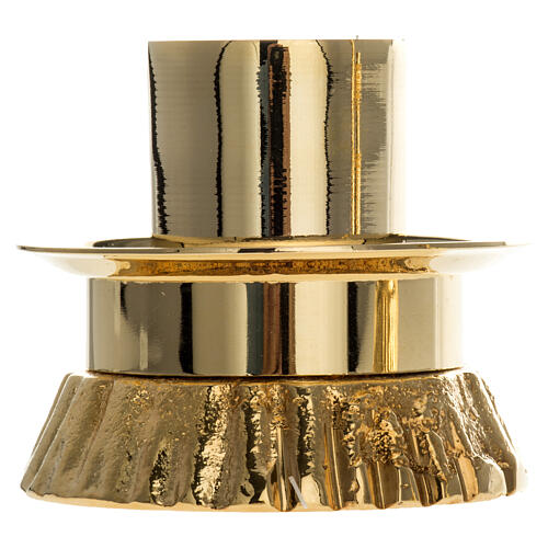 This golden brass candlestick features a round base with a mixed decoration of smooth and slightly grooved half profiles. With a diameter of 3.3 in and a socket of 1.26 in, it is perfect for standard candles and is suitable for both the main altar table and chapel use.