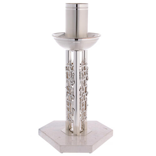 Stand for easter candle in satin metal with base in white marble. You can find coordinated objects such as candle-holders, mural crosses and liturgical lamps. This objects are produced by an Italian artisanal company specialised in the production of liturgical furniture. The top quality materials together with the craftsmanship manufacturing make these items really unique.