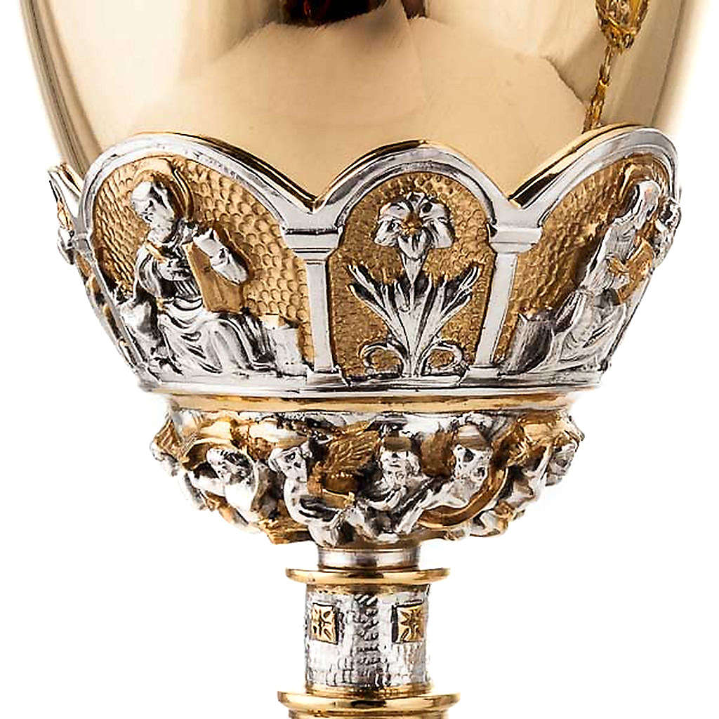 Chalice and ciborium made with lost-wax casting process. Chalice and ciborium in golden plated brass feature rich decoration in silver on the base depicting the Deposition of Jesus body from the cross, while on the lid the four evangelists' silhouette.
