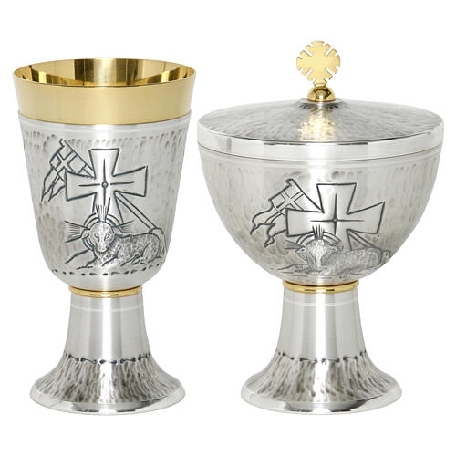 Chalice and ciborium with chiseled Paschal Lamb, silver-plated brass.