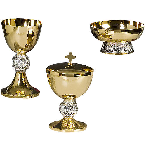 Chalice, ciborium and paten in gold plated brass and hand chiseled. The chalice and ciborium's node and the paten's base stem are silver, covered by resin and depict some grapes and crosses.