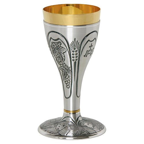 Chalice in chiseled silver-plated brass with grapes, IHS and Evangelists' symbols, 8 in.