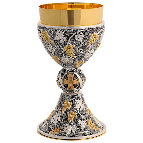 Chalice of 24K gold plated brass with grapes and leaves. Brass chalice of 450 ml capacity with grapes and leaves decoration in gold and antique silver finish.