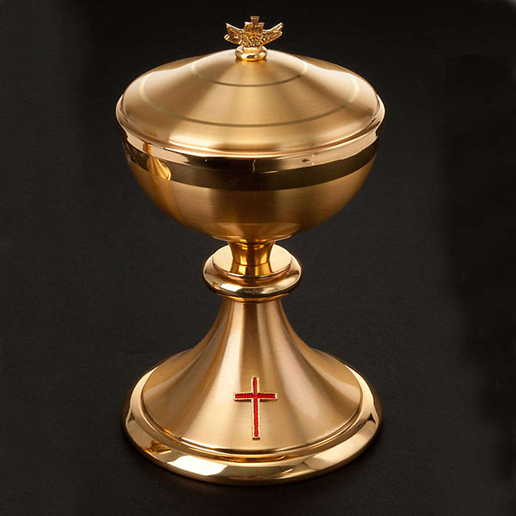 Chalice and ciborium made of gilded satin brass. On the base a red fringed golden cross has been applied.